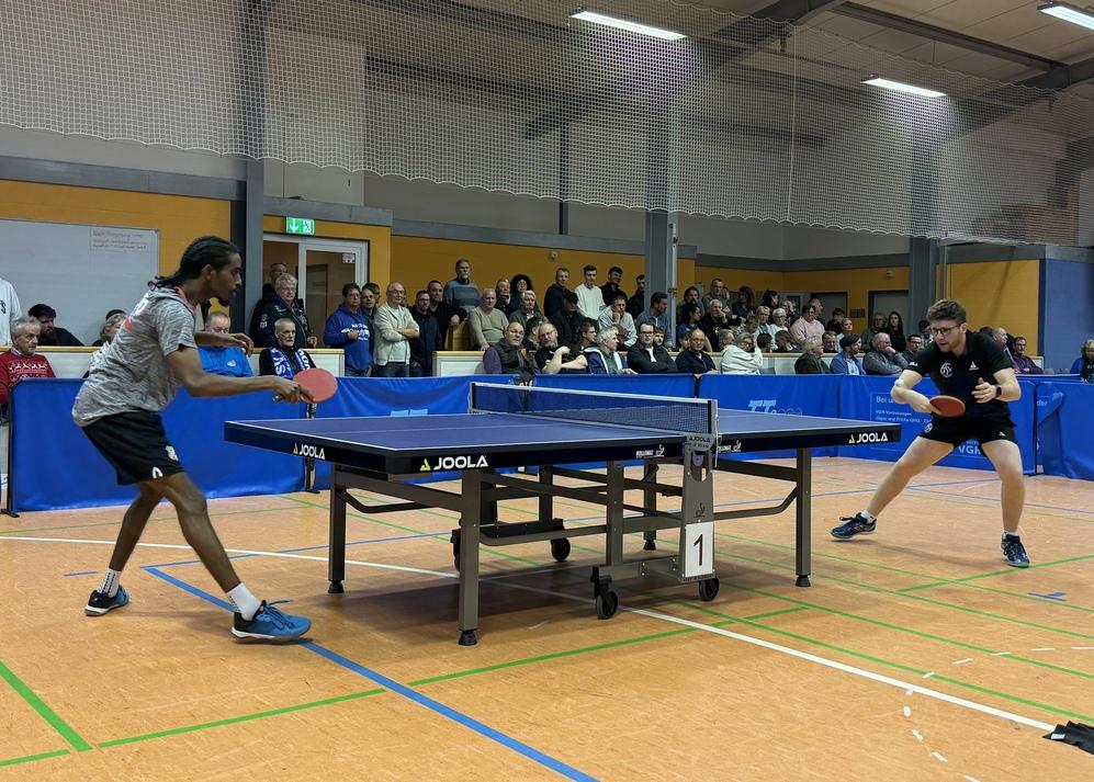 Im oberen Paarkreuz hatte Pätte die undankbare Aufgabe, gegen die starken Spitzenspieler der Gäste anzutreten. Trotz guter Leistung fand er nicht ins Spiel und ging zweimal mit 0:3 vom Tisch. Auch Maxi zeigte in beiden Einzeln eine starke Vorstellung, musste sich jedoch ebenso zweimal mit 0:3 geschlagen geben. Besonders spektakulär verlief das Match von Dwain gegen Artur Grela: Er spielte unglaublich stark und kämpfte sich bis in den fünften Satz. Dort fehlte am Ende das nötige Quäntchen Glück – mit 10:12 musste er seinem Gegner gratulieren. Auch im zweiten Einzel hielt Dwain lange dagegen, konnte aber die entscheidenden Punkte nicht setzen und verlor 0:3.
