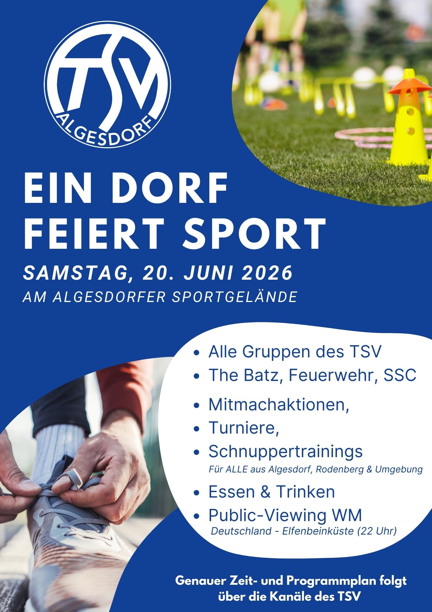 Wir wollen in diesem Jahr eine Neuauflage der Veranstaltung „Ein Dorf feiert Sport“ wagen. Am Samstag, den 20.06. wird es den ganzen Tag über sportliche Mitmachaktionen, Turniere, Vorstellungen und vieles weitere geben 💪🏼