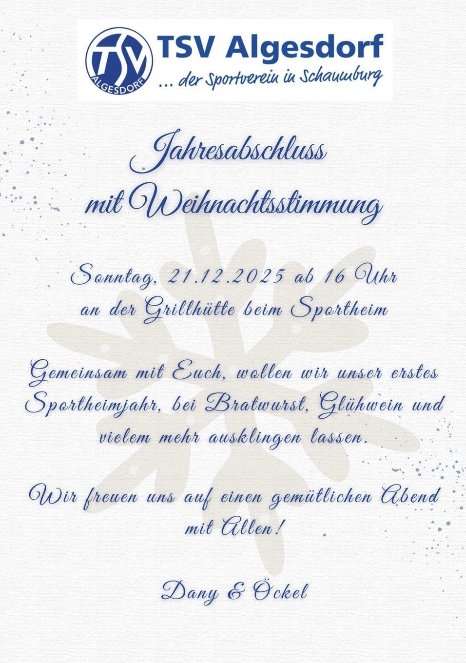 Ab 16:00 Uhr öffnen die Tore zur Grillhütte des Sportheims und die beiden freuen sich auf viele Gäste, die am Sonntag den Weg zum Sportplatz finden 🎅🏼🎄