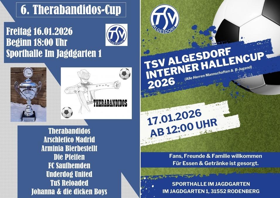 Den Beginn macht, nach einem Jahr Pause, der Therabandidos-Cup am Freitagabend, den 16.01.. Bereits zum 6. Mal richtet unsere Freizeitsport-Sparte dieses Turnier in der Rodenberger Halle „Im Jagdgarten“ aus. Durch etwas einseitige Turnierverläufe der letzten Turniere und Absagen von zuvor teilnehmenden Mannschaften der ersten Stunde starten die TSVer 2026 neu durch. 8 Fussball-Hobbymannschaften sind gemeldet und ermitteln im Spielmodus "jeder gegen jeden" den Sieger 🥇