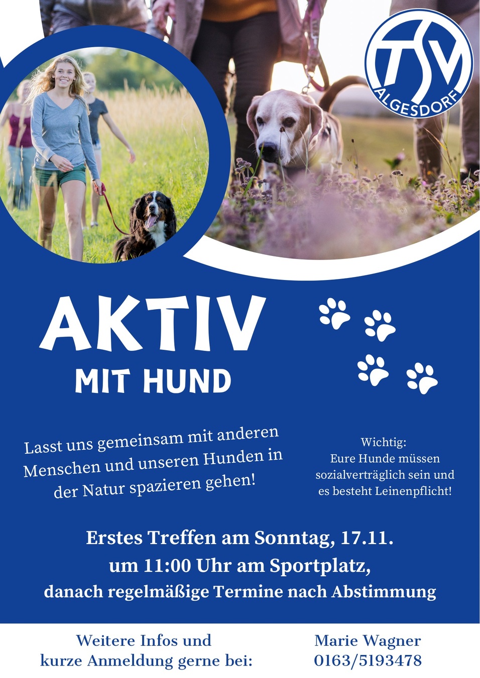 Wir freuen uns, ein neues Angebot im TSV aufnehmen zu können. Ab dem 17.11. bieten wir ein regelmäßiges Treffen zum gemeinsamen Spazierengehen mit Mensch und Hund an 🚶🏼♂️🐕😎