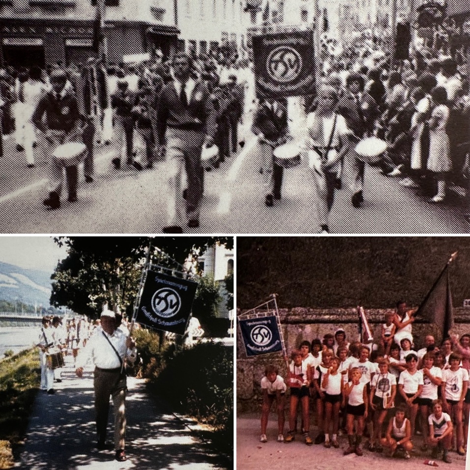 Natürlich wurde bei den abschließenden Umzügen durch die jeweilige Stadt stets die TSV-Fahne getragen.