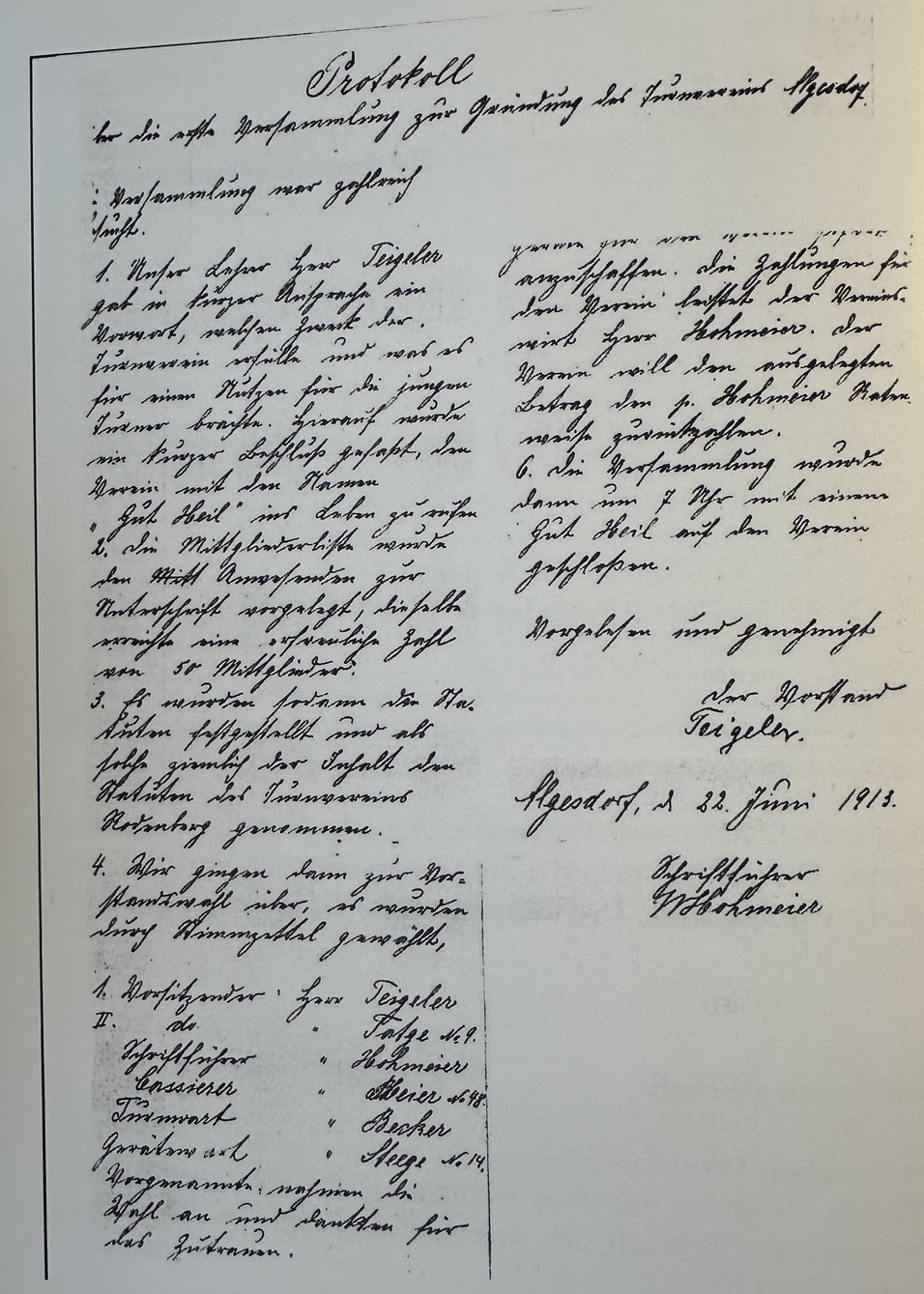 Am 22. Juni 1913 wird unser Verein als Turnverein "GutHeil" Algesdorf gegründet. Die Gründungsversamlung erfolgte in der Gaststätte "Zur Linde" mit 50 Algesdorfer Männern. Zum 1. Vorsitzenden wird Lehrer Teigeler gewählt.